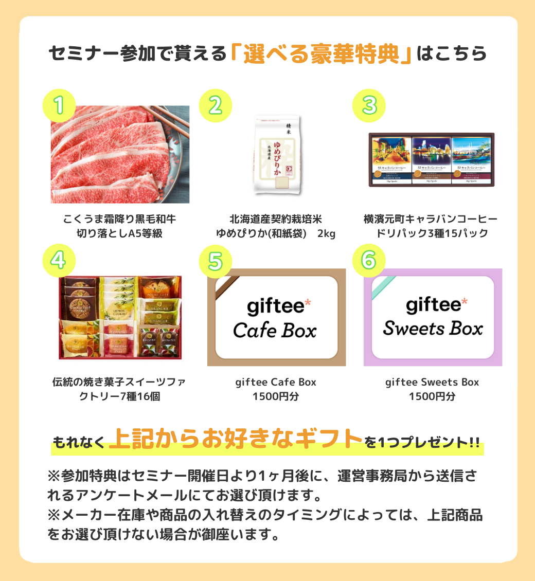 ※アットセミナーからの参加特典は商品券・アマゾンギフト券ではなく、「お好きなギフトを1つプレゼント」となります。