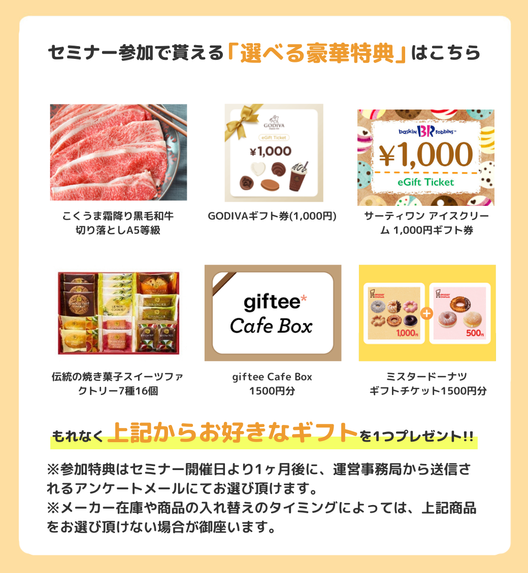 ※アットセミナーからの参加特典はポイント・商品券・アマゾンギフト券等ではなく、「お好きなギフトを1つプレゼント」となります。