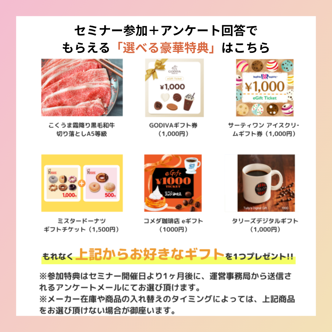 ※参加特典は、セミナー開催日から約1か月後、運営事務局よりお送りするアンケートメールからお選びいただけます。