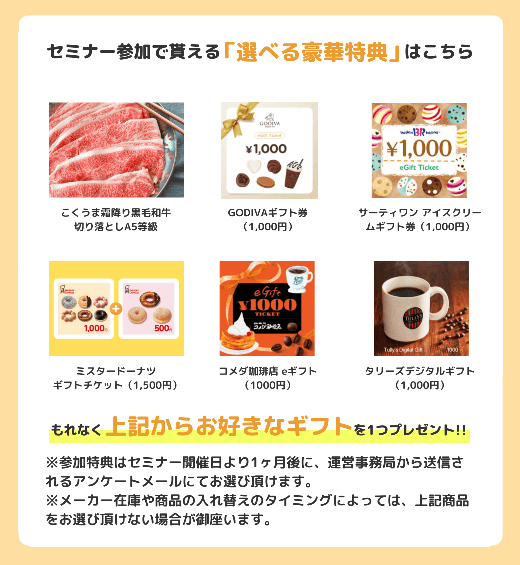 ※アットセミナーからの参加特典はポイント・商品券・アマゾンギフト券等ではなく、「お好きなギフトを1つプレゼント」となります。