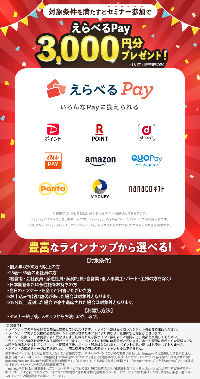 本セミナーはアットセミナーの特典に加えて開催企業からも【選べる豪華参加特典】のプレゼントがございます!