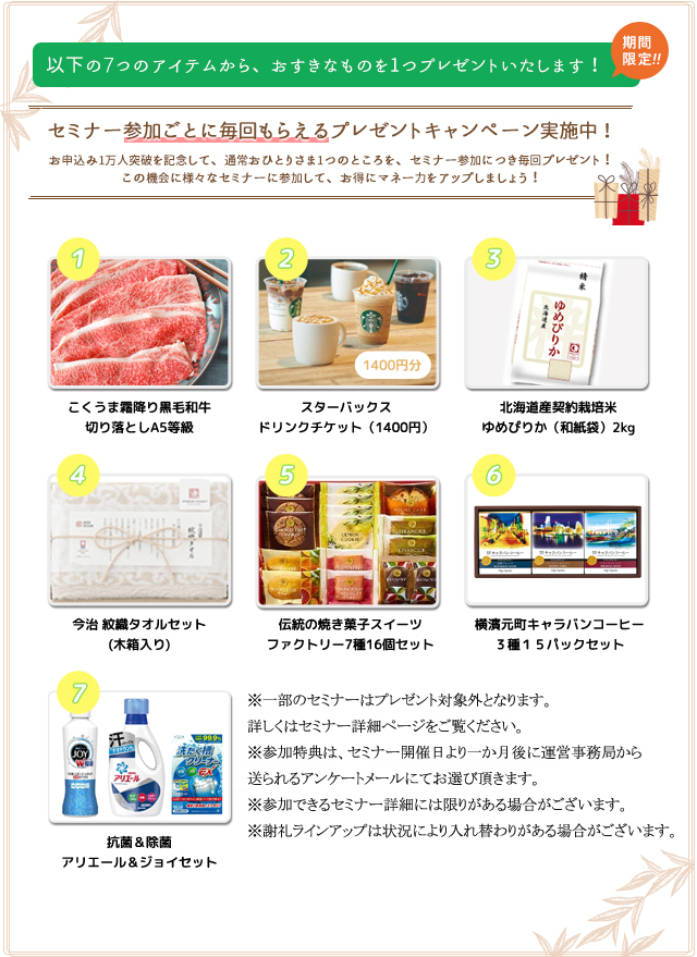 ※アットセミナーからの参加特典はポイント・商品券・アマゾンギフト券等ではなく、「お好きなギフトを1つプレゼント」となります。